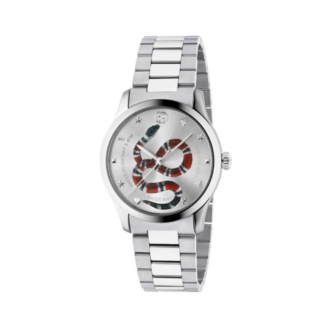 EL diseño icónico del reloj Gucci que combina elegancia y personalidad con la emblemática serpiente en el centro de la esfera.