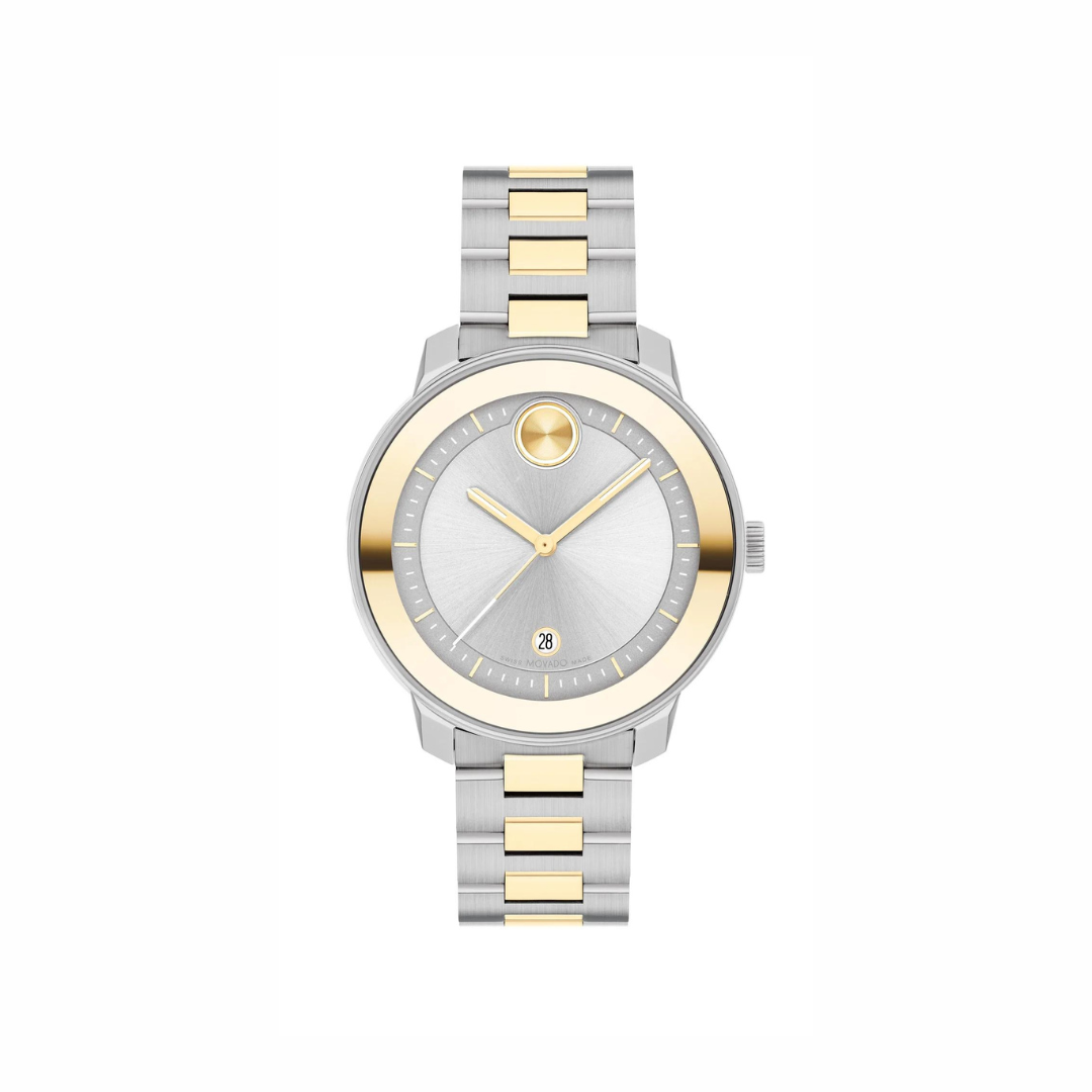 La caja de acero inoxidable se complementa con un bisel interior dorado que enmarca la esfera, mientras que el brazalete bicolor integra eslabones plateados con detalles centrales en dorado, logrando un estilo moderno y versátil. Incorpora ventana de fecha a las 6 horas, sumando funcionalidad sin perder la estética limpia característica de Movado.
