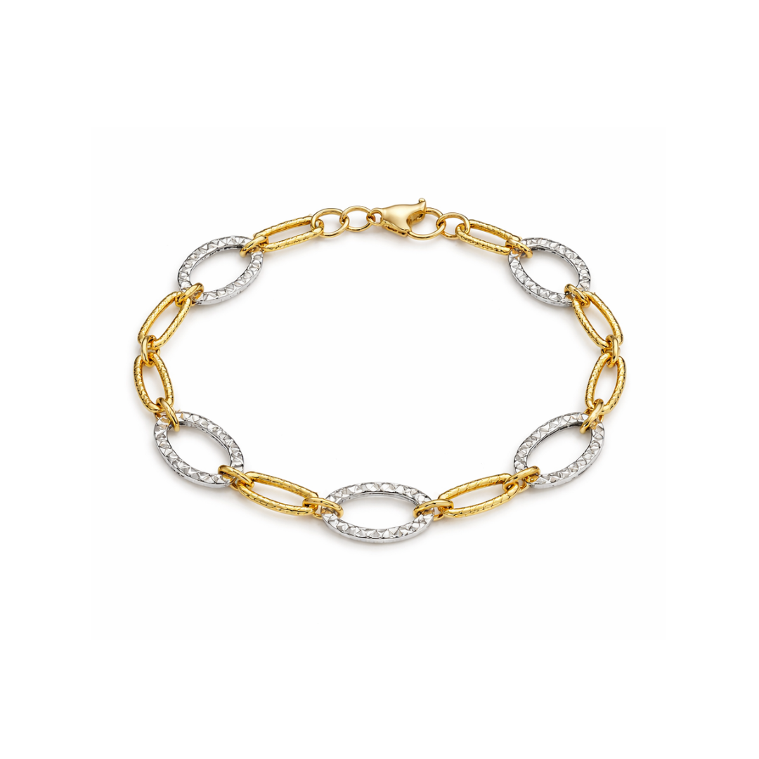 Pulsera confeccionada en oro bicolor, combinando eslabones en oro amarillo y oro blanco con textura facetada que aporta brillo y movimiento a la pieza. Su diseño moderno y elegante la convierte en un accesorio versátil, ideal para uso diario o para complementar looks más sofisticados.