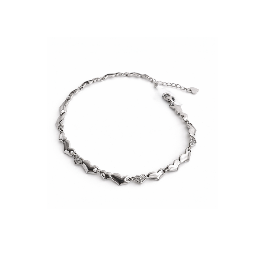 Confeccionada en plata, combina corazones pulidos con pequeños corazones con cubic que aportan un brillo sutil y elegante. Su diseño articulado se adapta cómodamente a la muñeca y el alargue regulable permite un ajuste perfecto.